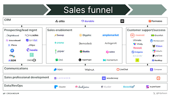 Siim noticed two LT teams in this (both second-time founders) - AskToSell and InfiniteReps. But there is more, such as Salesforge.ai, and other firms bringing in AI features. The RevTech graph below is from Creandum on AI-first RevTech revolution, and worth noticing that Mavenoid has Lithuanian co-founder / CTO, while Tidio CMO is also a familiar face.