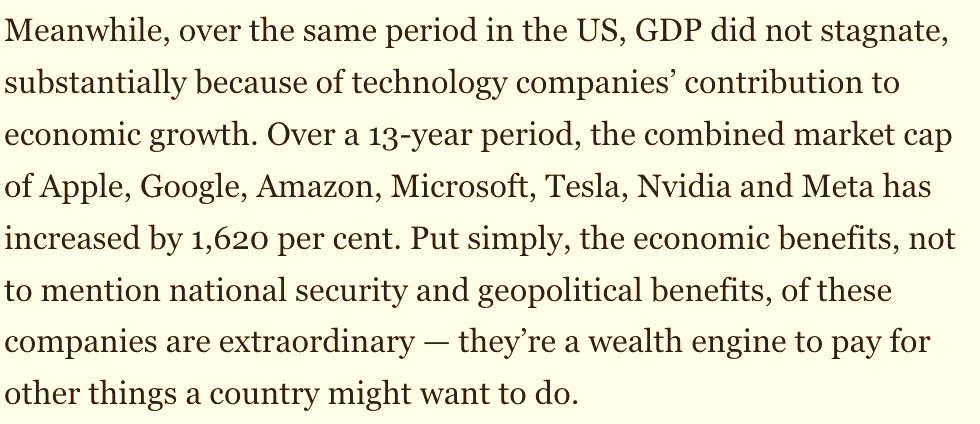 - Can't easily process all these floating ideas about "Ministry for the regions" or other oversimplifications regarding "supporting manufacturers, upgrading, sustainability". The facts are there – Europe lost growth because growth was largely pulled by technology companies. That is beyond software, but other newcomers driven by tech and exponential growth (SpaceX, Nvidia, Tesla). Yes, saving and upgrading industrials in Europe is a nice idea, but we will get peanut returns from all these "digital transformations" (check how Germany is succeeding). Some readings / listens around these topics