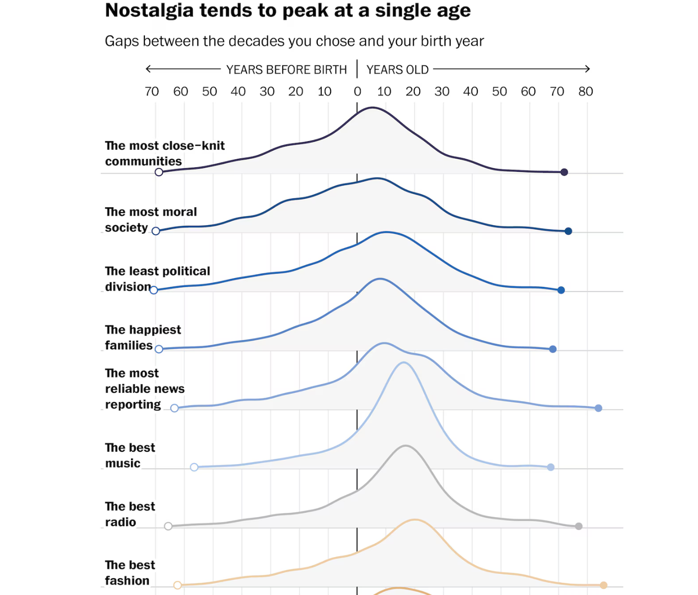 - WaPo reports on the fascinating data that show everyone thinks that everything – from the best movies and music to trustworthy news and political unity – peaked during their second decade of life. After that, it’s all downhill.