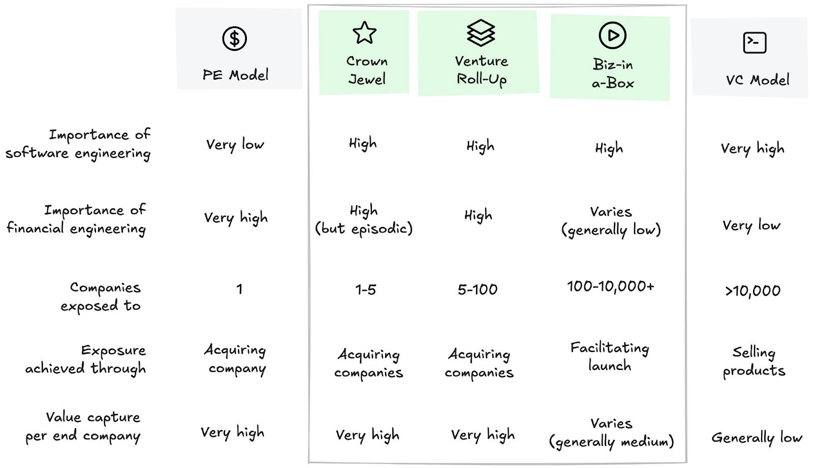 - Both venture and PE models have revealed their limitations, and search for more models continues. Matt Brown has a good text, the graph below is illustrative but not comprehensive – there is more variety in models and levers.
