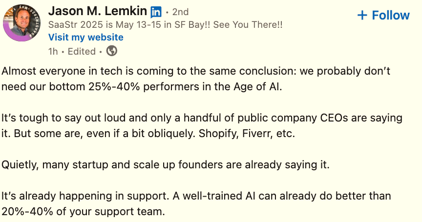 - Young People Can't Get Jobs. Now What? (you might say this is too alarming, but let's agree up to a degree – AI will easily destroy entry-level jobs for multiple white-collar jobs in spaces like law, consulting, accounting, marketing, etc. – another study here). Another pointer from Jason Lemkin: