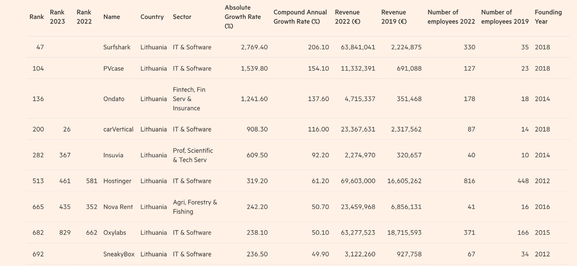 - Fastest. Annual FT1000 list includes 9 LT firms - all impressive in growth. Taking note on the Tesonet family, some revenue machines are under one roof (Surfshark €63M, Hostinger €69M, Oxylabs €63M - and these are 2022 figures, and exclude NordVPN).