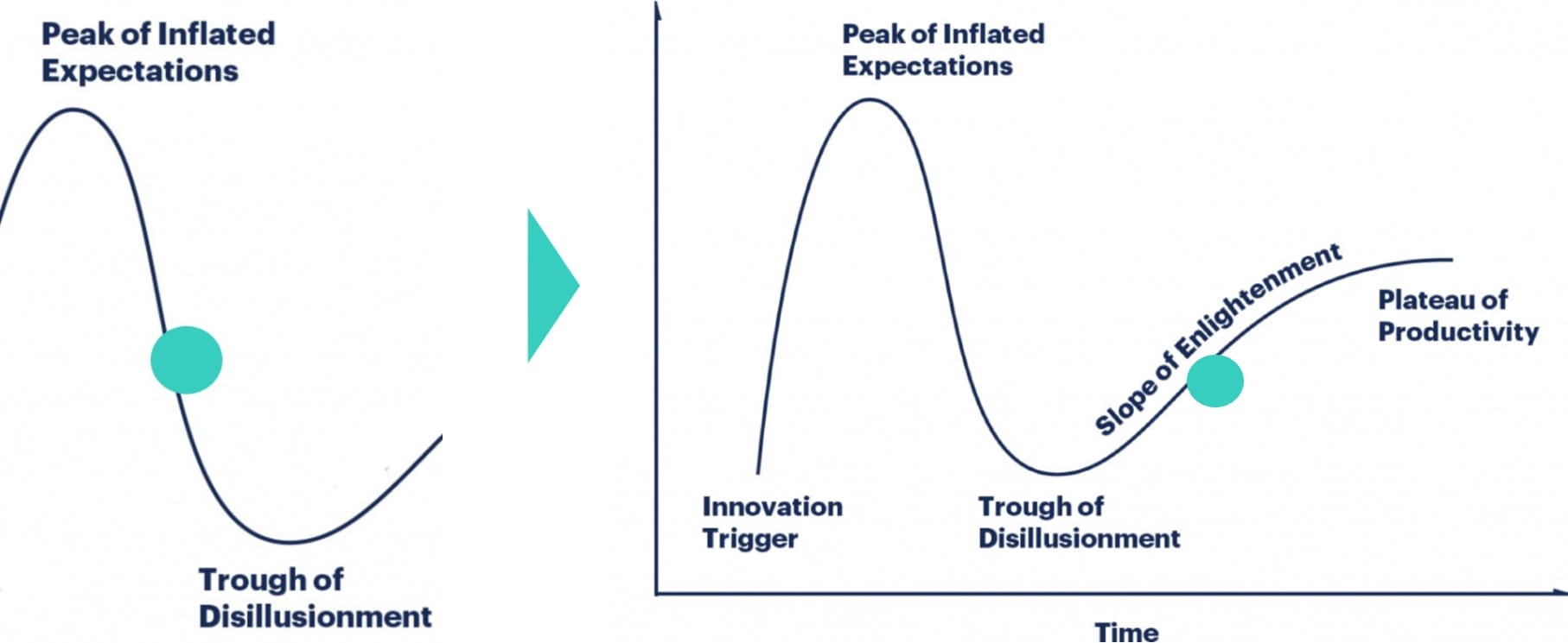 Did we miss that again? Just learned that Waymo's autonomous cars are landing in London, but few months ago it seemed like they would never get commercialized? It's a bit of a trap. We know every new technology shift first hits the hype (peak of expectations). Then advancement slows down, and we start to dismiss it. And it beomes easy to miss it, as tech continues to improve and it returns to the market better, faster, cheaper.