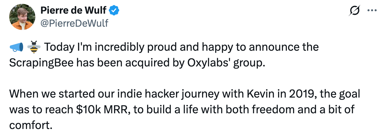 Before you're into billions of value (but in hundreds of millions valuation), founders and CEOs are responsible for growth, which often needs to go beyond organic. Oxylabs closed their second acquisition, acquiring a well-established brand ScrapingBee, with a reported "8-figure all-cash deal" – just a little more than the ScrapingBee founders initially planned for:
