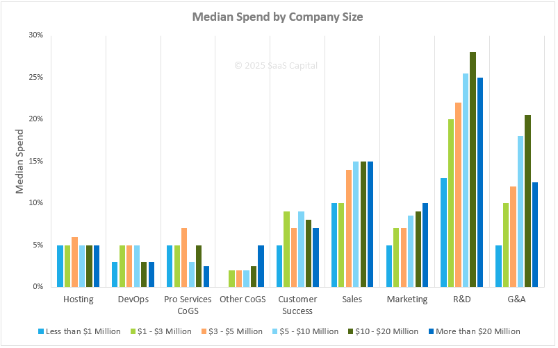 - SaaS spending by ARR levels (US data) – like 15% on sales when you grow bigger (and 10% marketing).