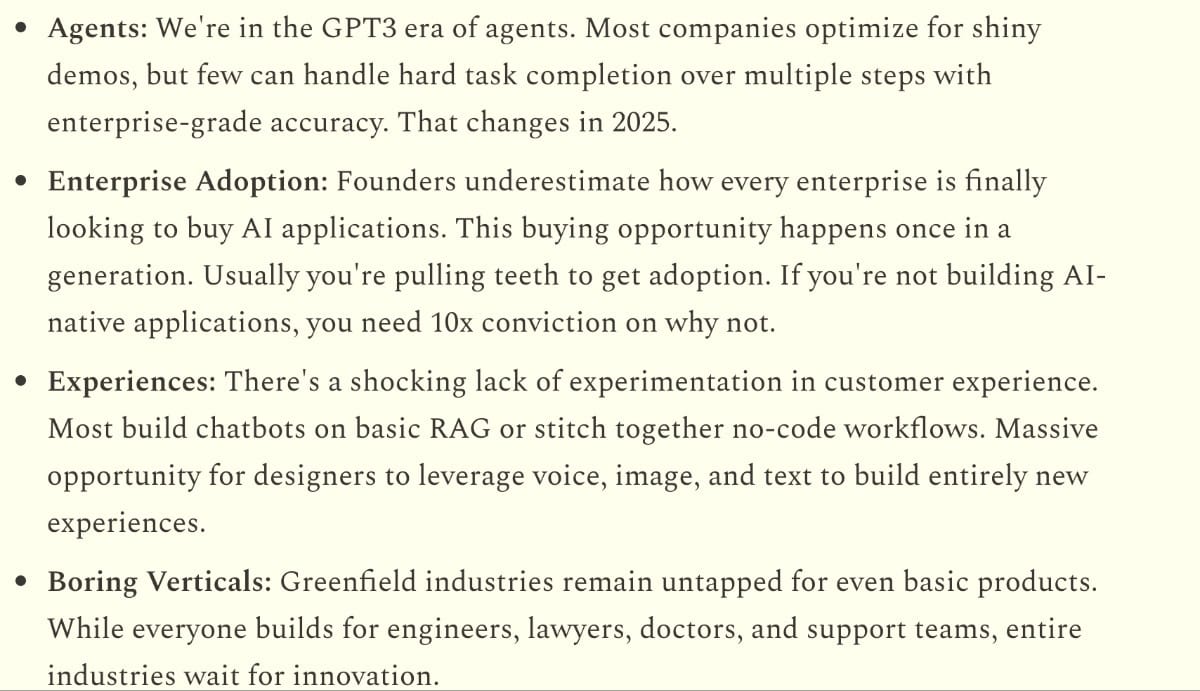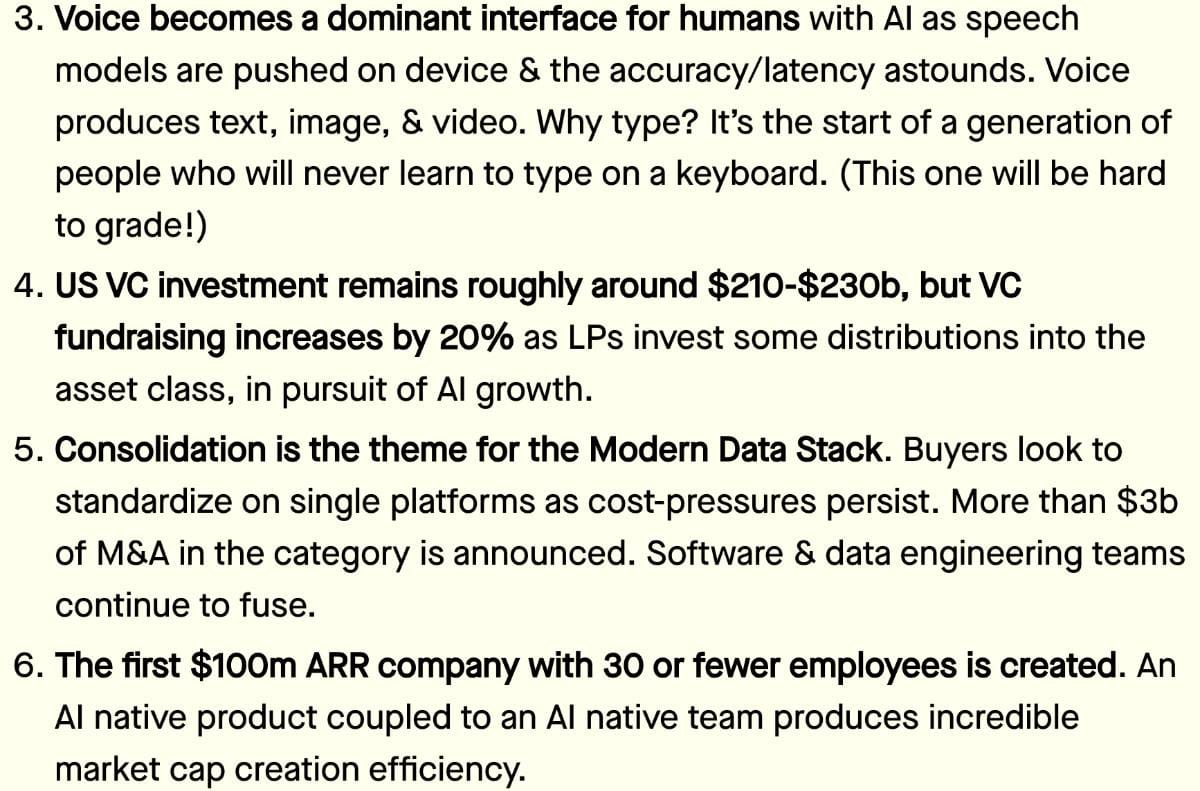 - AI accelerated bifurcation in venture: excitement with enterprise buyers drives broad adoption (tools being bought not sold) and scaling is way beyond expected (quintuple-quadruple instead of triple triple). Good example is Lovable hitting 4m ARR in 4 weeks