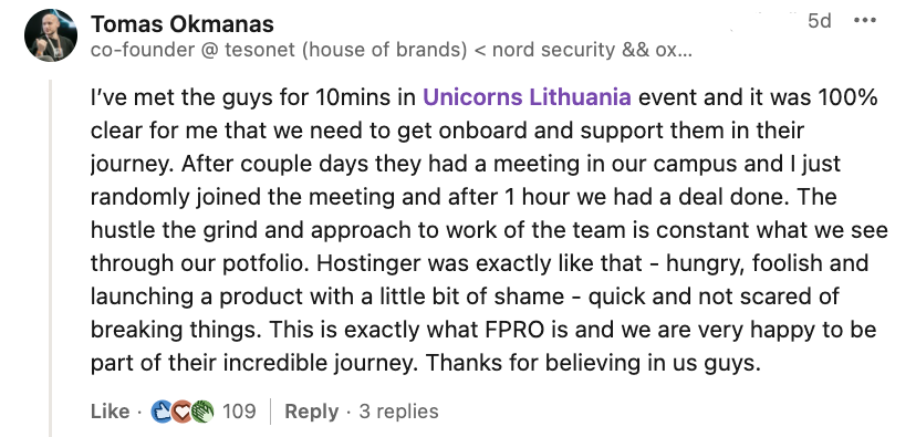 - FPRO, home-based football training app with 140k+ customers already, receives EUR 2M investment from Tesonet. Moving fast is the keyword here.